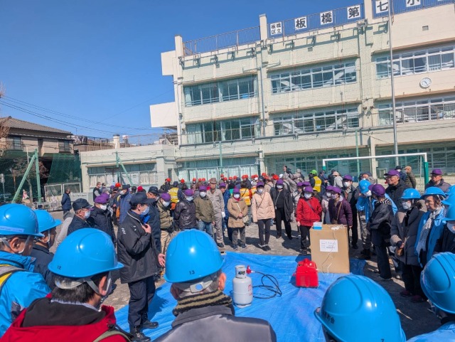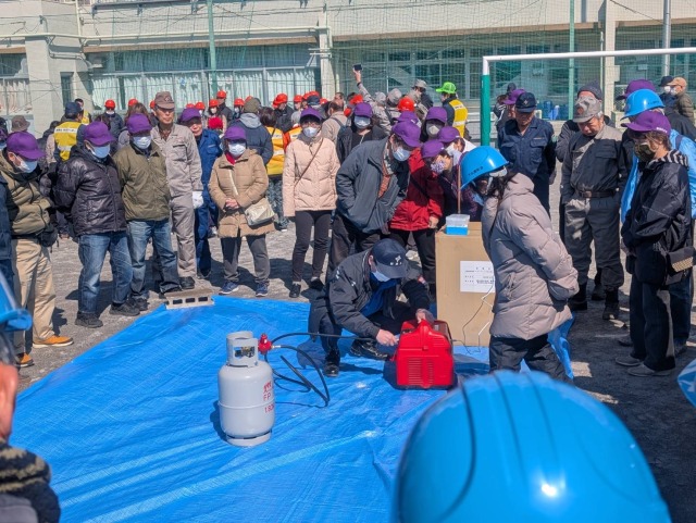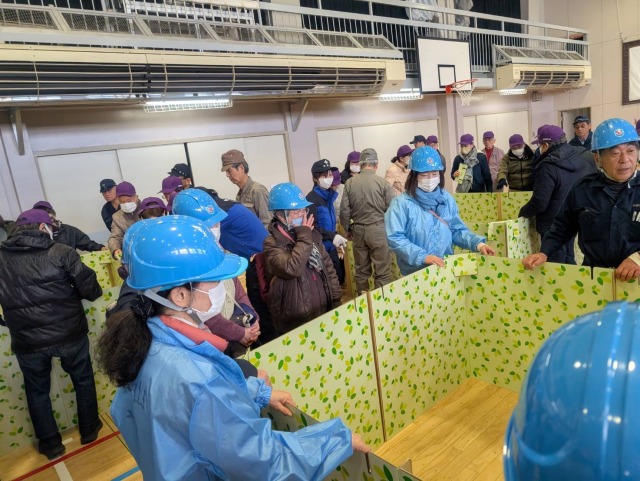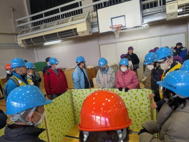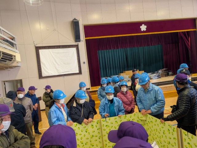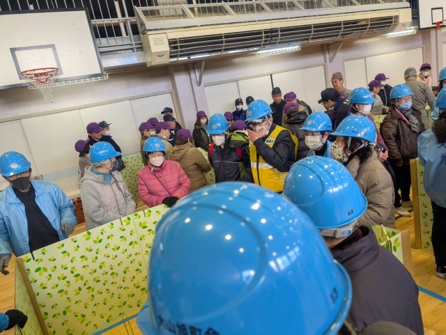 令和7年3月9日(日)に「熊野地区 総合防災訓練」が実施されました。大山旭町会からは30名の方に参加頂きました。今回の訓練では、体育館内に仮設避難所を設営して実際の大きさなどを実感して頂く新たな訓練内容も加わりました。テレビなどで映るよりも実感として狭いこと、隣の空間を区切るパーティションも想定していたよりも低いことなど、実際に被災され避難を強いられている方達の苦労を実感できる貴重な機会となりました。