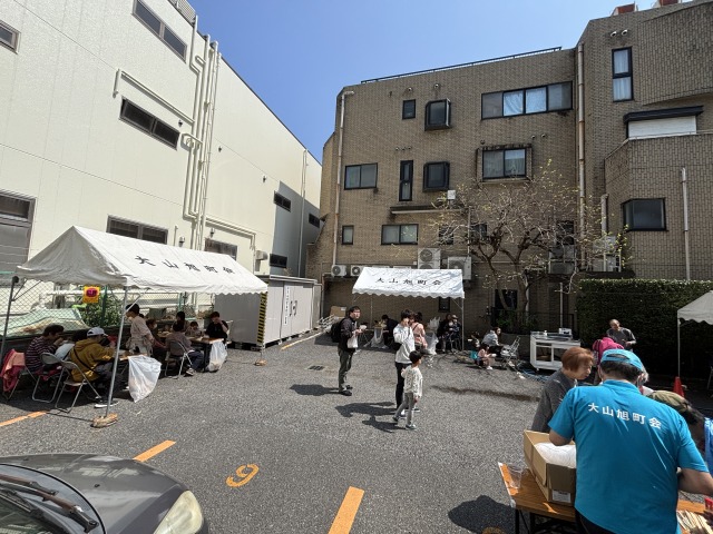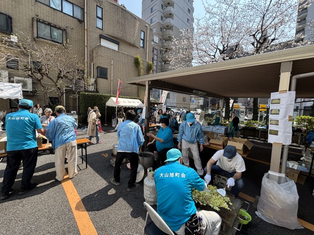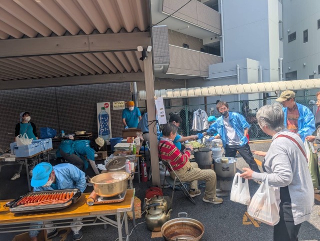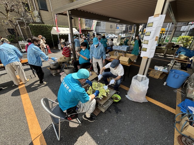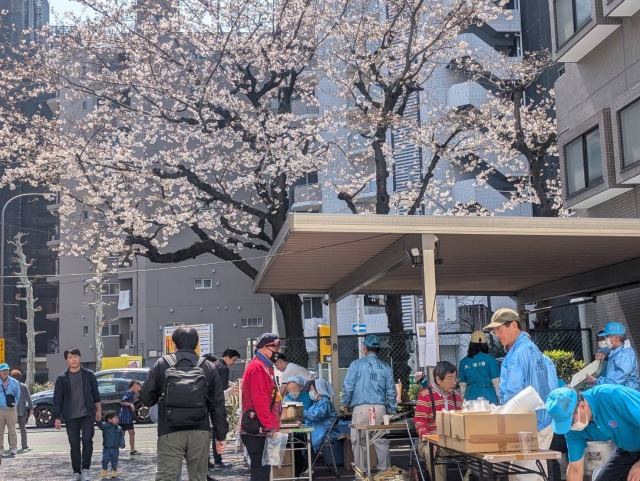 災害時を想定した炊き出しとして豚汁を調理しました。豚汁は無料で配給致しました。お花見も兼ねていましたので、お花見のお供に町会から焼きそば、フランクフルト、ジュースを鑪(たたら)さんとカフェはぐくみんさんからは生ビールとカップシフォンケーキを販売致しました。